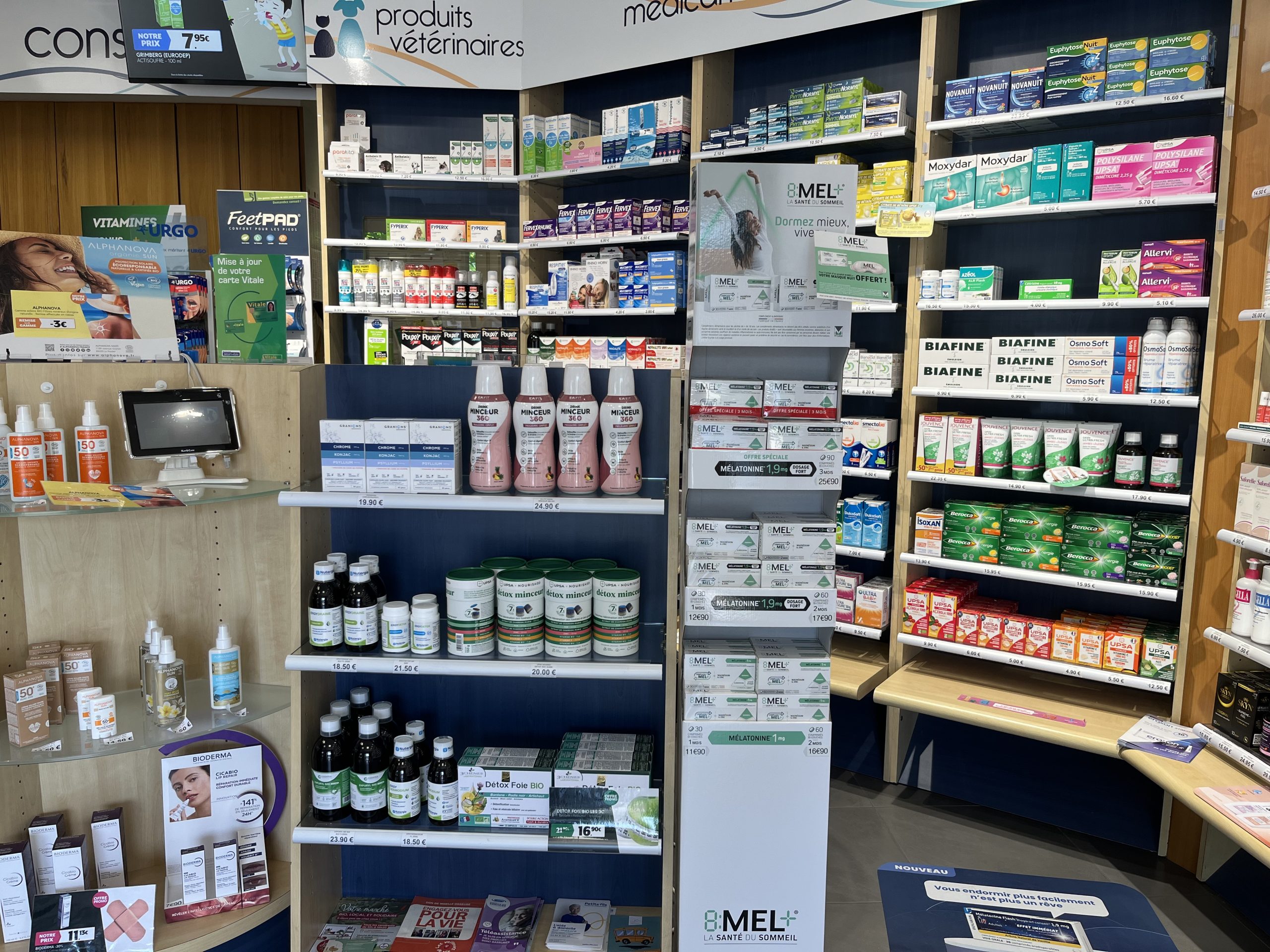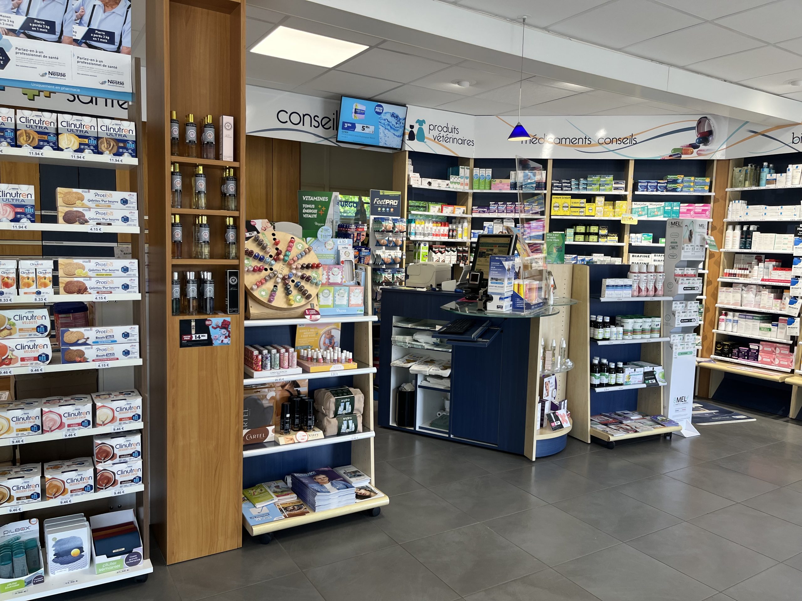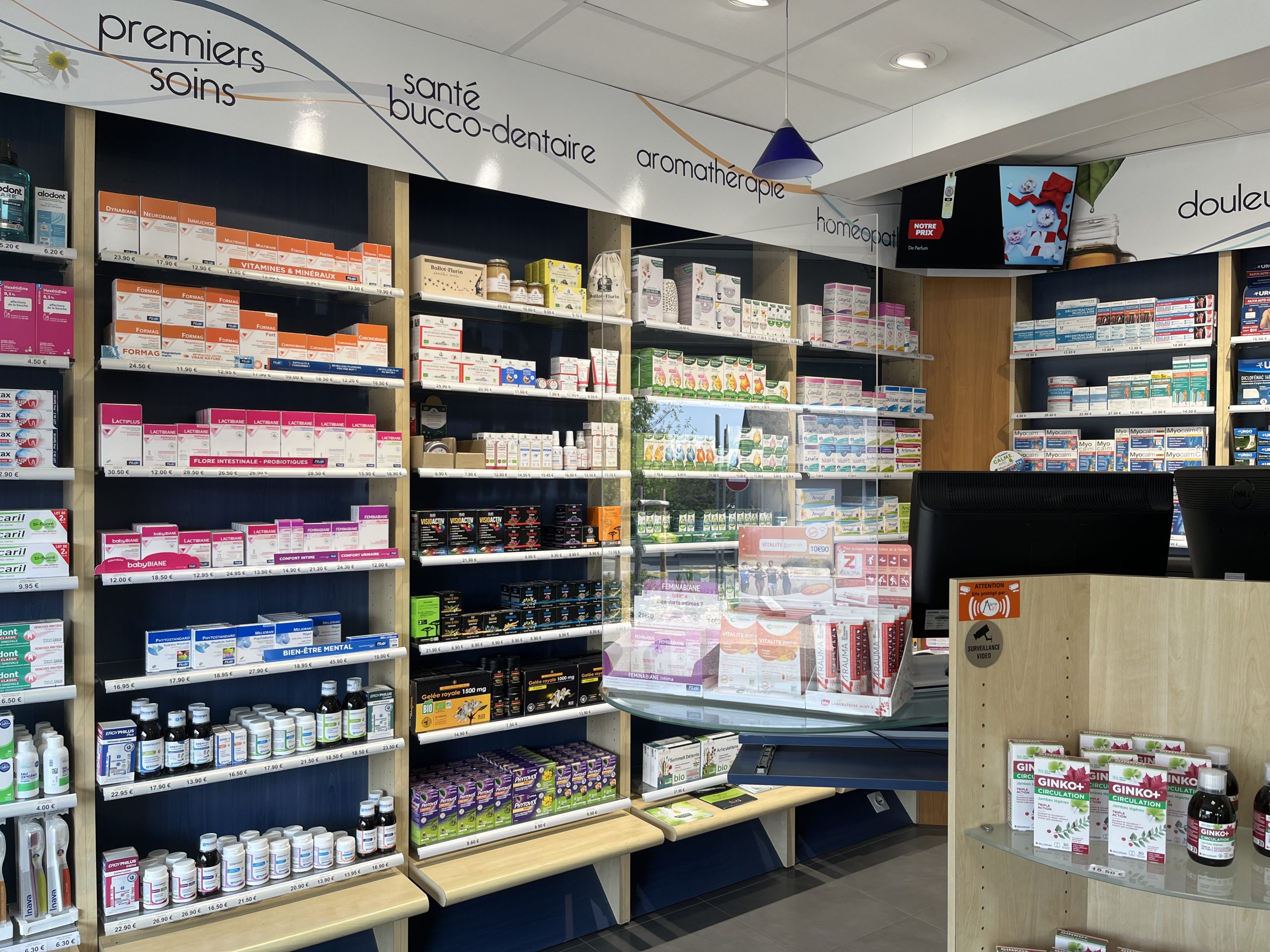 Notre officine vend de nombreux produits : compléments alimentaires, huiles essentielles, matériel d’orthopédie (colliers cervicaux, genouillères, bas de contention), produits vétérinaires ou encore tensiomètres.